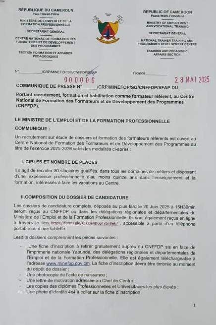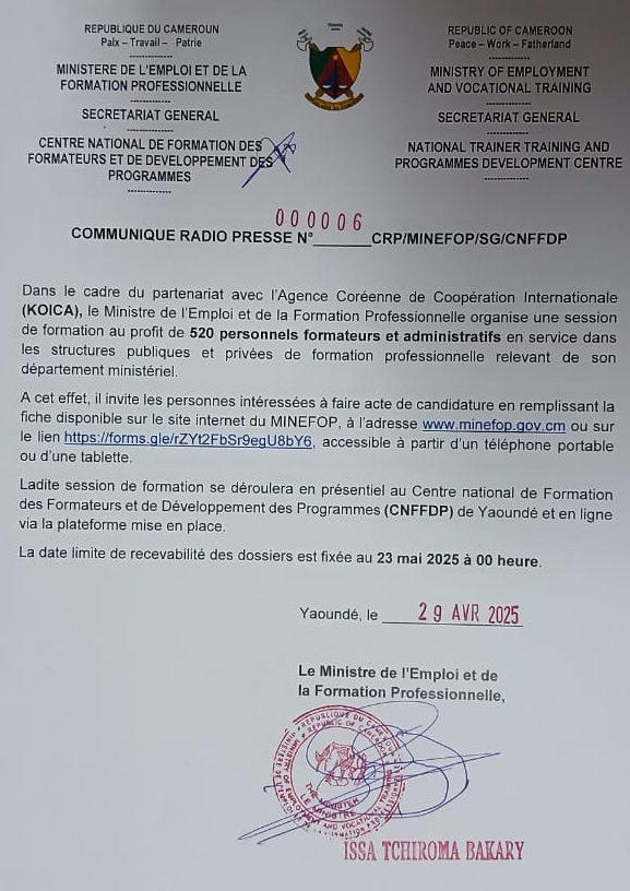 En application des hautes instructions du Ministre de l’emploi et de la Formation Professionnelle Monsieur ISSA TCHIROMA BAKARY, le personnel du CNFFDP a procédé ce lundi 16 juin 2025 à la levée des couleurs à l’esplanade du bâtiment principal du MINEFOP. Encadrée par le chef service de l’action sociale et le chef service du personnel du…