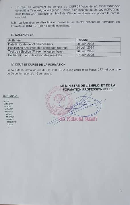 - Une fiche d’inscription à retirer gratuitement auprès du CNFFDP sis en face de l’imprimerie nationale Yaoundé, des délégations régionales et départementales de l’Emploi et de la Formation Professionnelle. Elle est également téléchargeable à l’adresse www.minefop.gov.cm. La fiche d’inscription devra être timbrée au moment du dépôt de dossier